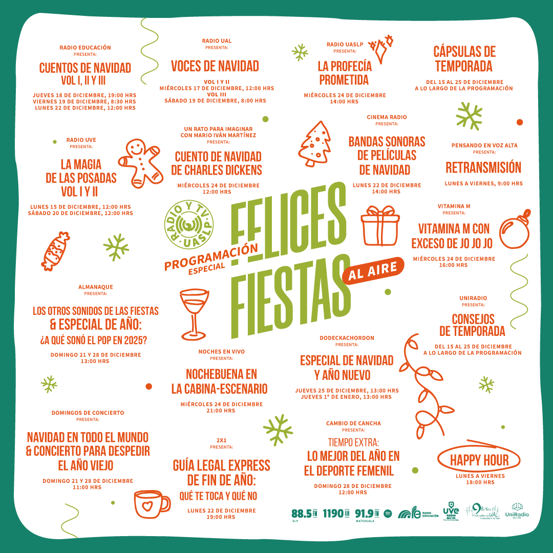 Con motivo de la temporada decembrina, Radio presenta su Programación Especial “Felices Fiestas 2025”, una propuesta que reúne programas, cuentos, cápsulas y música, especialmente creados por nuestros programas y por las producciones de radios hermanas, con el objetivo de acompañar a las audiencias durante las celebraciones de fin de año.