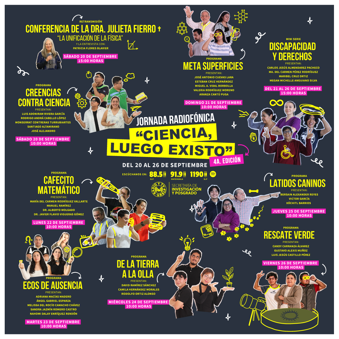 La Dirección de Radio y Televisión en conjunto con la Secretaría de Investigación y Posgrado de la UASLP y La Feria de la ciencia; llevará a cabo del 20 al 26 de septiembre “Ciencia, luego existo”, en su cuarta edición; un proyecto con la finalidad de divulgación científica a través de diversas actividades.